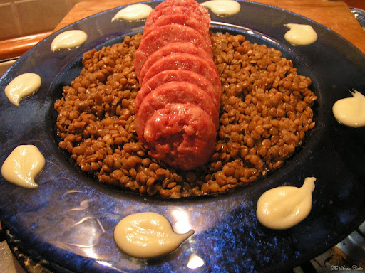 Io, stavolta non ho faticato granchè, ho comprato il cotechino che si vende ai supermercati quelli in scatola, ho solo messo la busta con il cotechino in una pentola d'acqua e ho fatto bollire. A parte ho lessato le lenticchie, poi condite con un pò d'olio , sale. Una volta che avete aperto la busta, prelevate la carne e servitela su di un letto di lenticchie e accompagnate con del purè di patate o se volete delle patate duchesse.